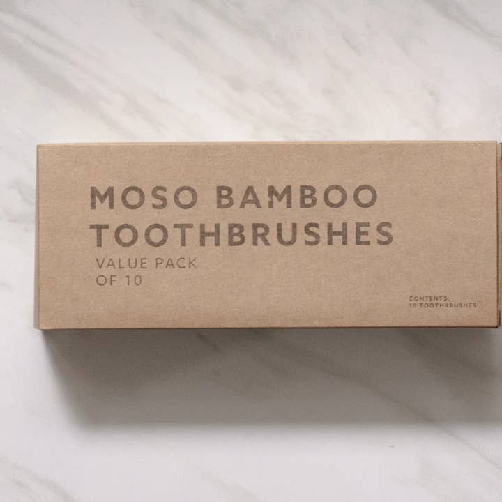 Packaging: Kraft paper box (each toothbrush comes in an individual box which is printed). Outer pack of 10 has printing on it and says “Moso bamboo toothbrushes”, with product details on the back. No UPC code included on outer packaging (but available upon request). UPC code on the inner packaging.
