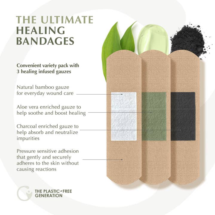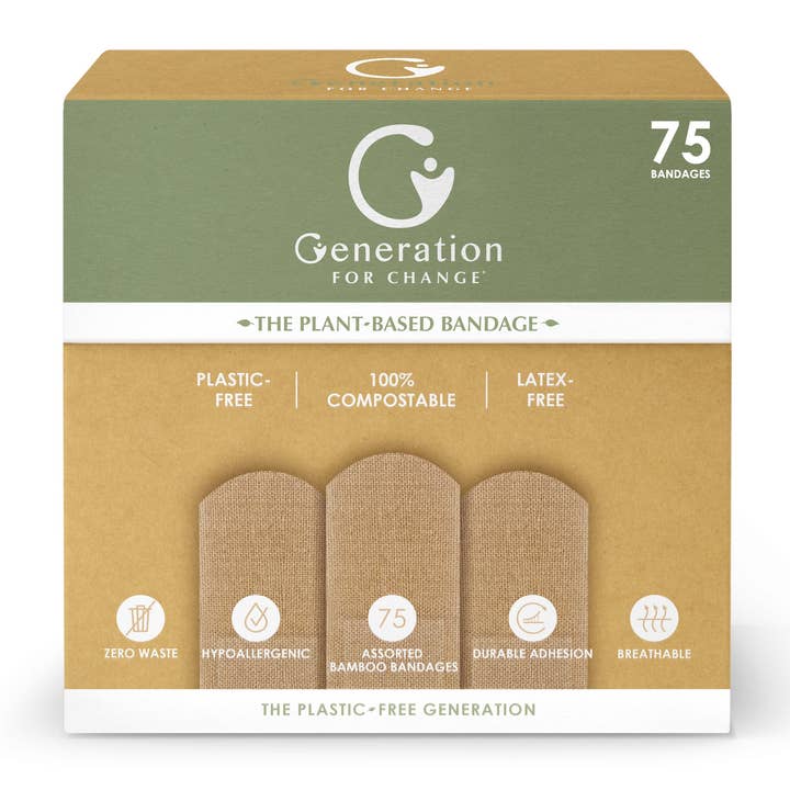 The Plant-Based Bandage by Generation For Change | 75 Organic Bamboo Bandages | Variety Pack – Aloe, Charcoal & Natural Bamboo | Compostable